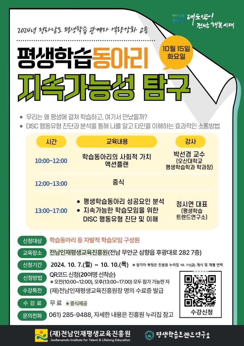 2024년 전라남도 평생학습 관계자 역량강화 교육 참가자를 다음과 같이 추가 모집합니다.