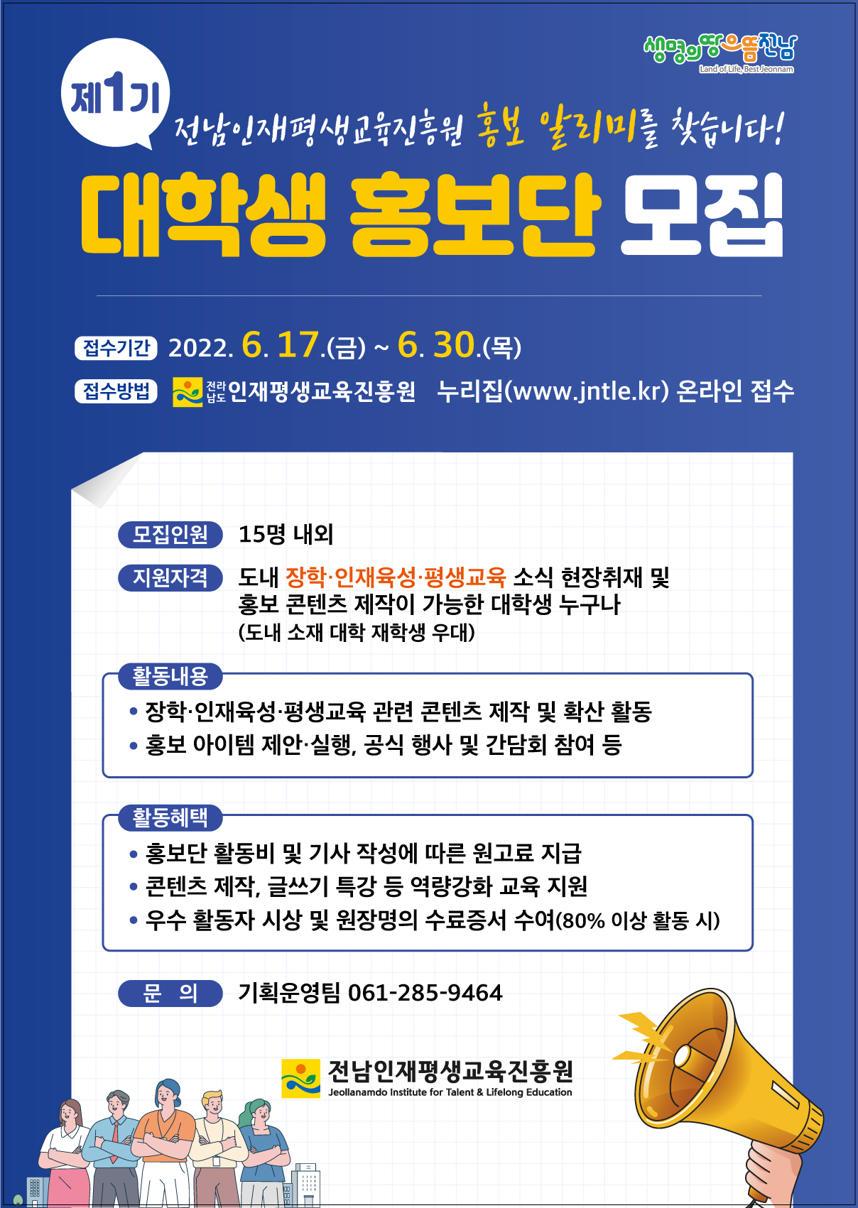 제1기 대학생 홍보단을 모집하오니 많은 관심과 참여 바랍니다.
