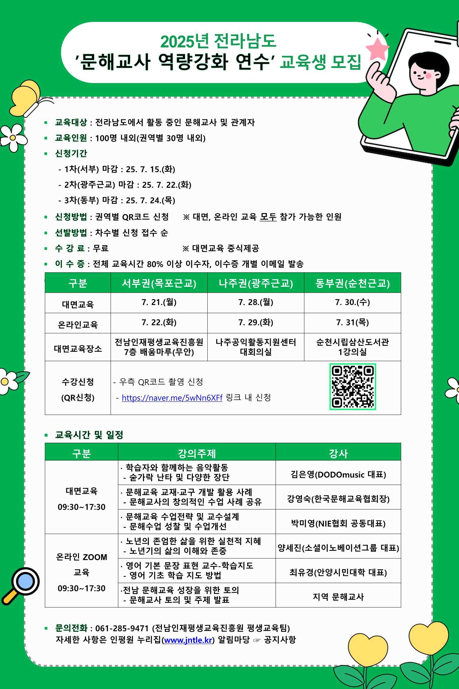 다음과 같이 2025년 전라남도 문해교사 역량강화 연수 교육생을 모집하오니 많은 참여 부탁드립니다.