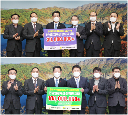 (재)전남인재평생교육진흥원(이사장 김영록)은 28일 ㈜해양에너지와 (재)녹색에너지연구원이 전남의 인재 육성을 위해 각각 3천만 원과 1억 원의 장학금을 기탁했다고 밝혔다.
