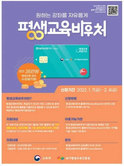 교육부와 국가평생교육진흥원은 7일부터 다음달 4일까지 2022년 평생교육이용권 신청을 받는다고 6일 밝혔다.