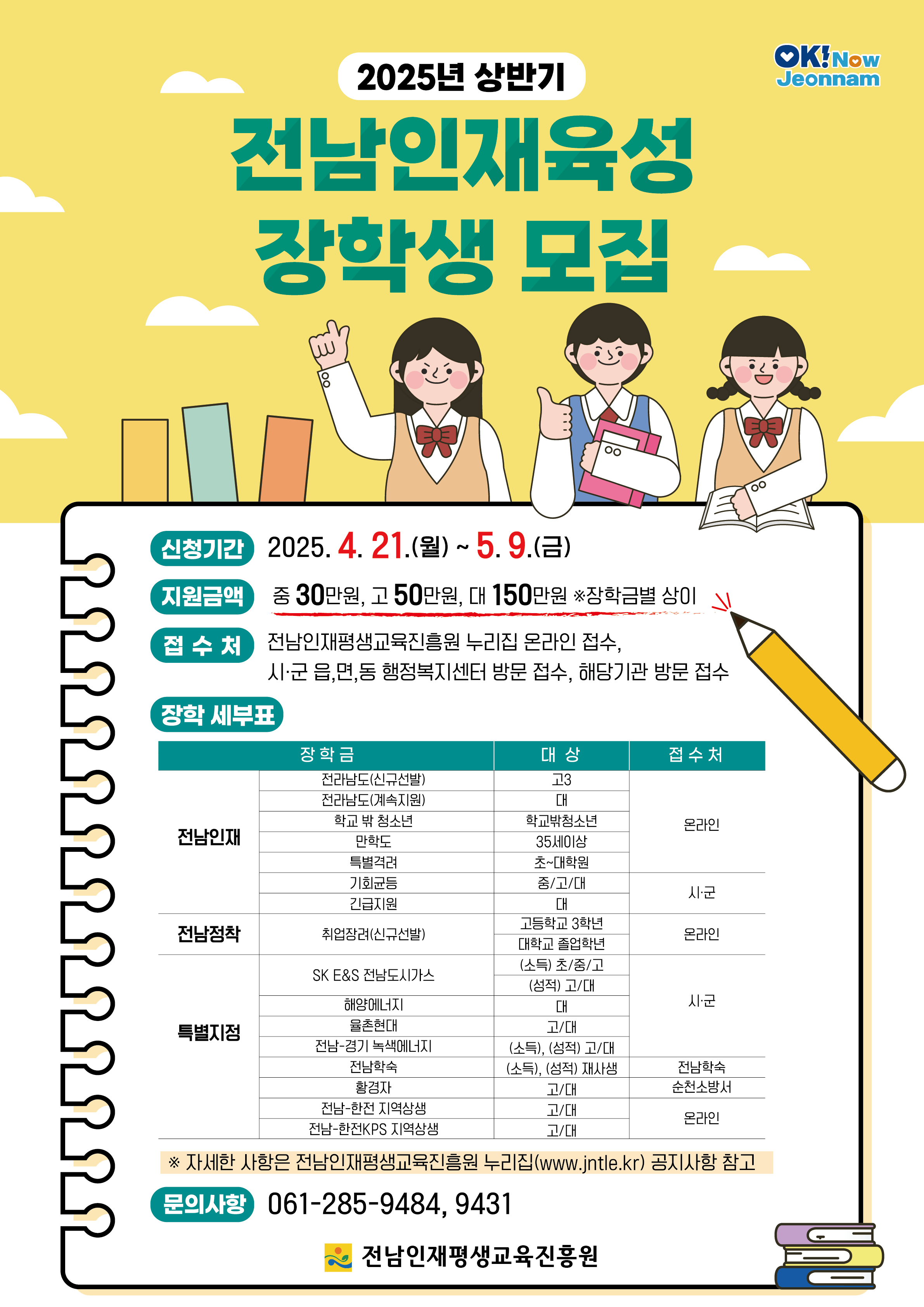 전라남도와 전남인재평생교육진흥원은 실질적 교육 기회 보장과 미래 인재로의 성장·정착 지원을 위해 2025년 상반기 전남인재육성 장학생을 5월 9일까지 모집한다.