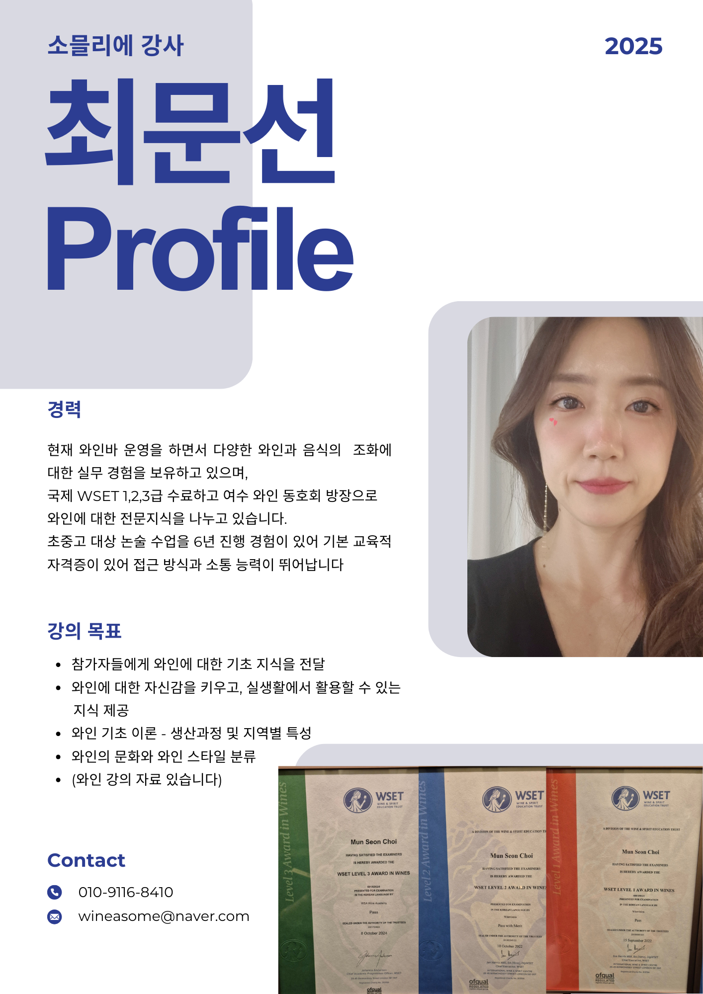 국제 WSET 1.2.3급을 보유하고 와인업계에 종사하고 있습니다. (cs 서비스 경영자격 시험 이수 중입니다)
