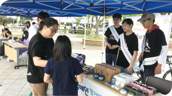 하나의 유형이 아닌 시각, 지체, 지적, 신장 등 다양한 유형의 장애인들이 참여하였습니다. 서로 특성은 다르지만 꽃을 좋아하는 공통된 마음을 가지고 처음 시작하였으며, 어느새 모두들 친한 언니동생 사이가 되었습니다.