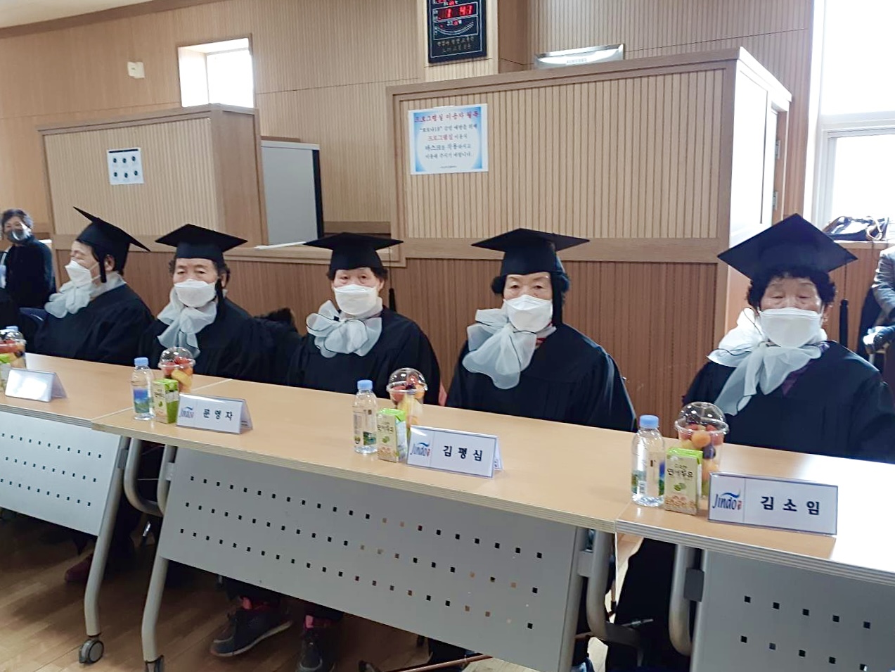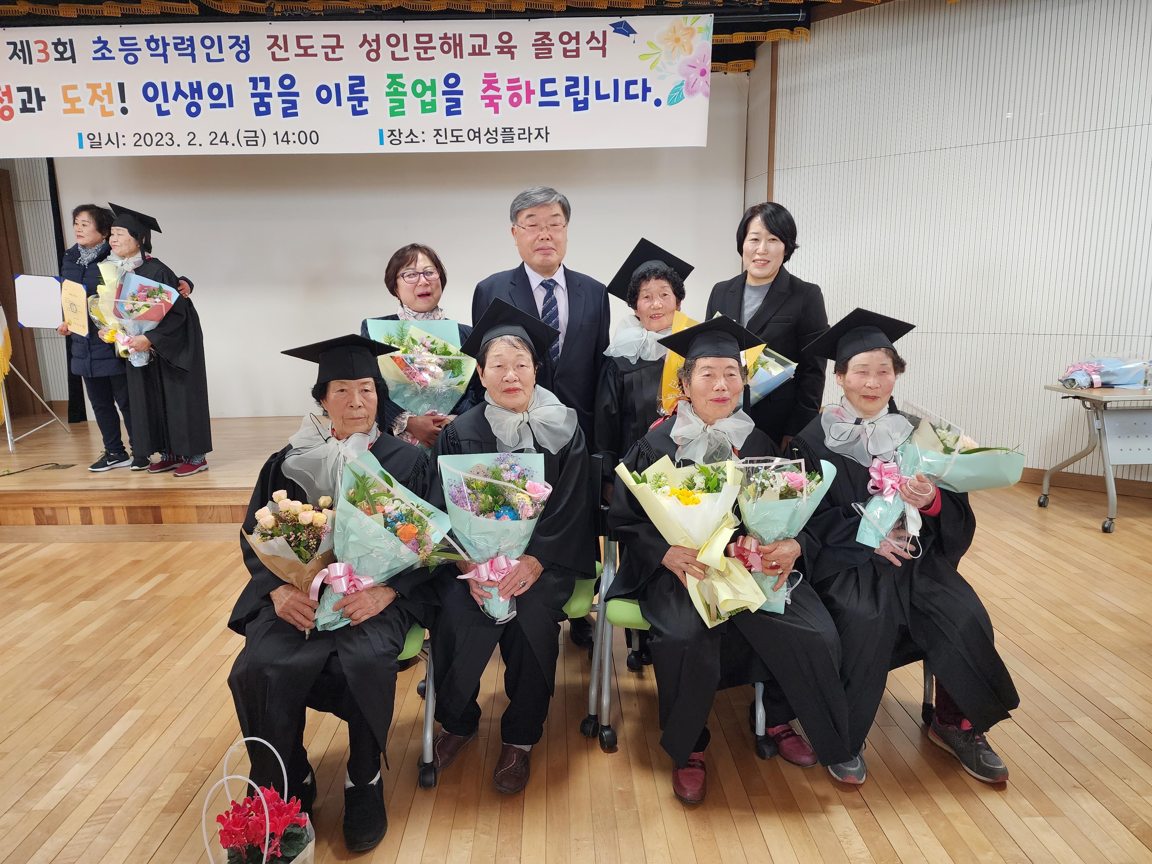 진도군에서는 지난 2월 24일 전남인재평생교육원의 성인 문해교육 프로그램의 일환으로, 3년 과정을 마치면 초등학교 졸업을 인정해주는 문해교육 이수자들을 위한 졸업식이 거행되었다. 금년이 3회째인데, 졸업을 하게 되는 어르신이 모두 23명이다.