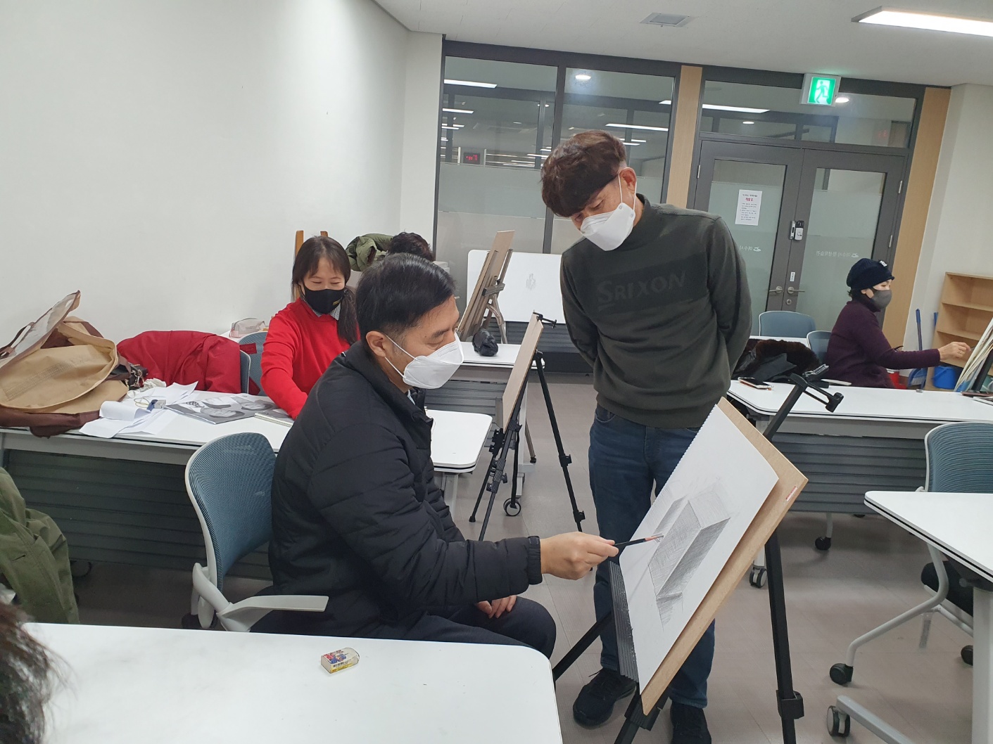 수업 내용은 ‘원과 정육면체 하얀 석고상’을 연필로 색칠하는 것이었다. 강사는 수강생이 작업하는 것을 보고 나서 개인지도를 해주었다. 색을 진하게 칠하기 위해서는 연필을 눕혀서 또 힘을 주어서 그리며, 약하게 칠하기 위해서는 연필을 세워서 힘을 약하게 준다는 것을 배웠다.