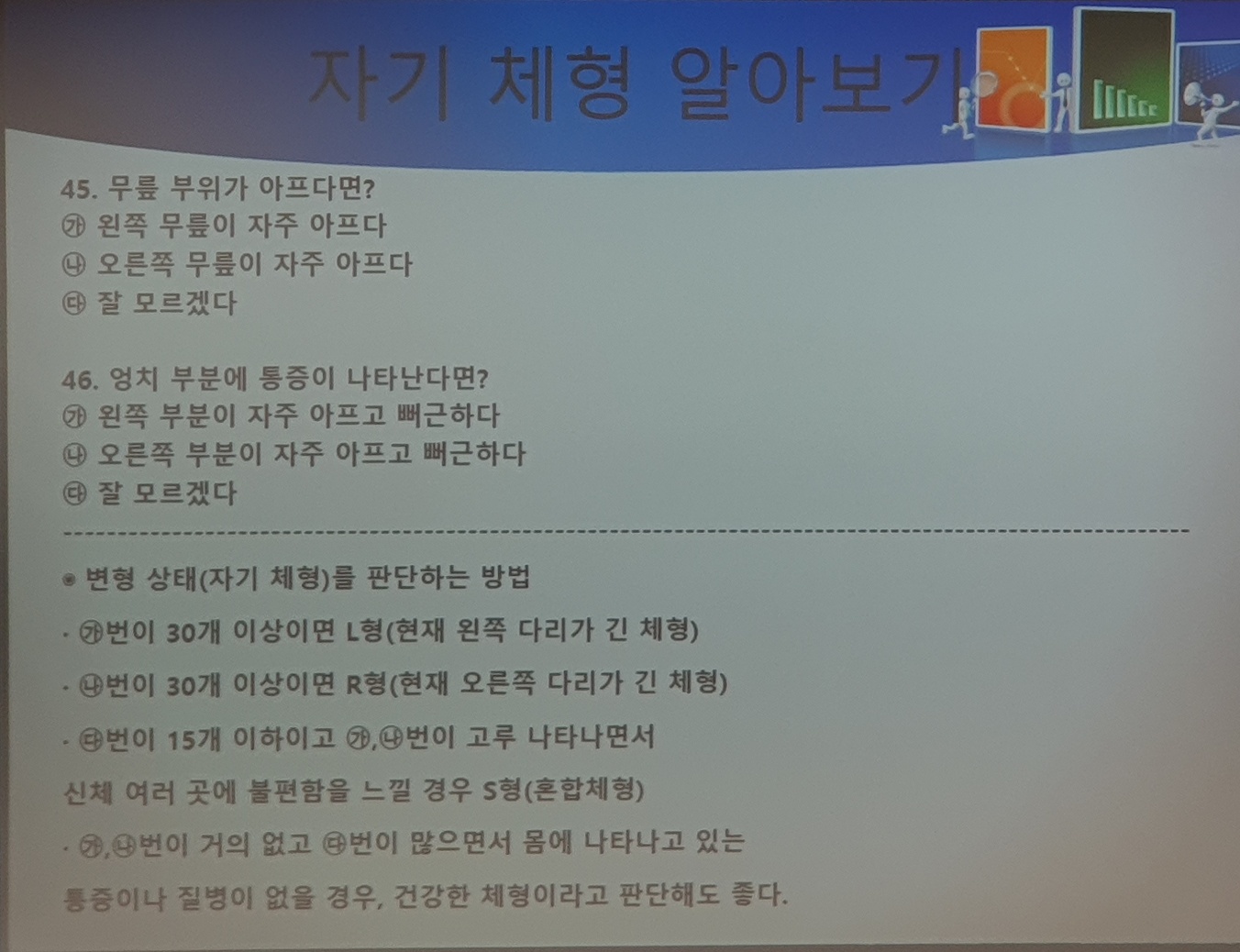 본 기자가 지난 1월 16일(월) ‘운동 처방 재활반(강사 강현승 순천제일대학교 재활과 교수)’에서 2번째 강의 시간에 1시간 30분 동안 청강생으로 수업을 받으면서 취재하였다. 수강생들은 자기 스스로 앞 화면의 내용을 보면서 변형상태를 점검하고 있는데(사진 참고), 또 다른 점검법으로 둘이서 상대방의 체형 점검해주기가 있다. 앞쪽에서 관찰하기, 옆쪽에서 관찰하기, 뒤쪽에서 관찰하기 등으로 특히 오른쪽 다리가 긴 사람을 잘 살펴보면, 어떤 동작을 할 때 오른발을 먼저 사용하고, 앉을 때 오른발이 위로 올라간다. 이것을 교정하기 위해서는 왼발을 먼저 움직이고, 앉을 때 왼발을 위로 올린다.
