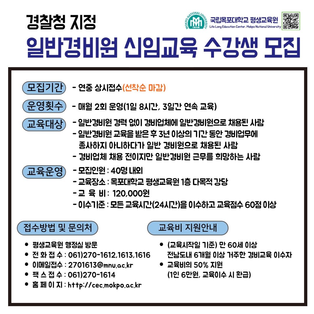 ‘일반경비원 신임교육과정’은 매월 선착순으로 모집하고 있으며, 수강신청 접수는 평생교육원 방문 또는 전화(☎061-270-1612~3), 팩스(FAX 061-270-1614), 이메일(2701613@mnu.ac.kr)로 가능하다. 기타 자세한 사항은 홈페이지(cec.mokpo.ac.kr) 및 행정실로 문의 시 안내받을 수 있다.