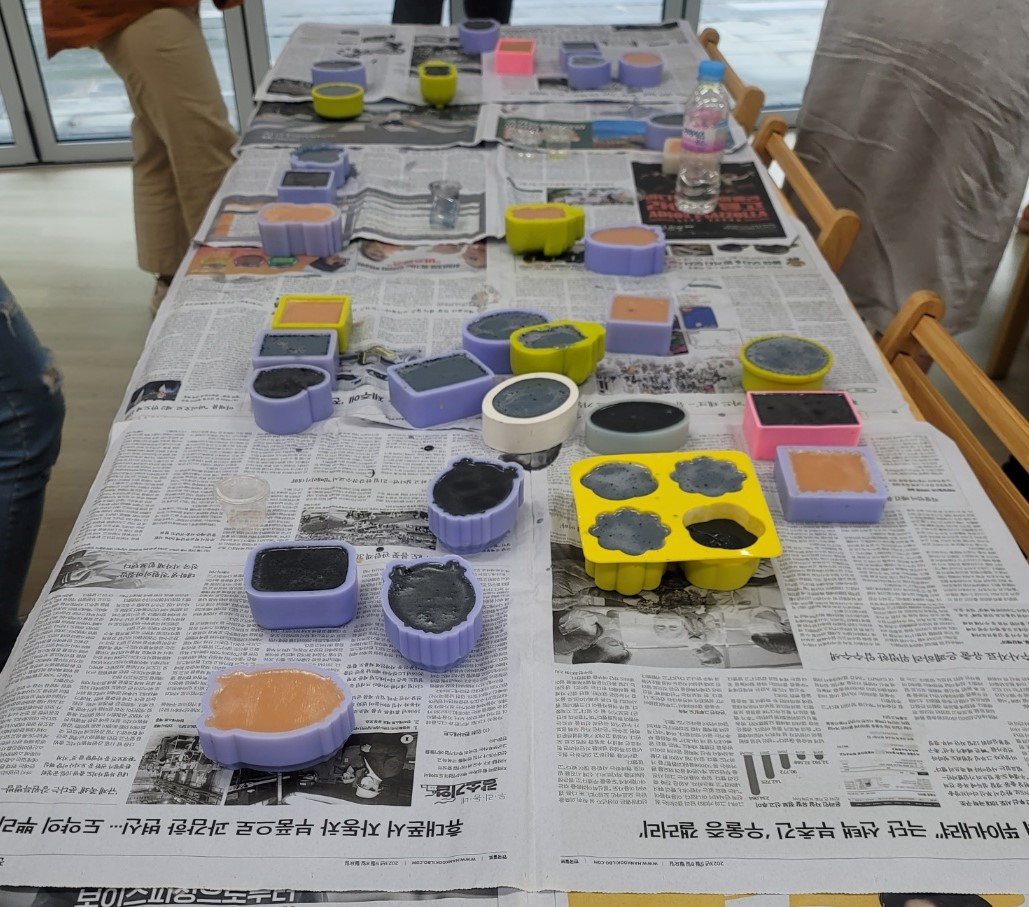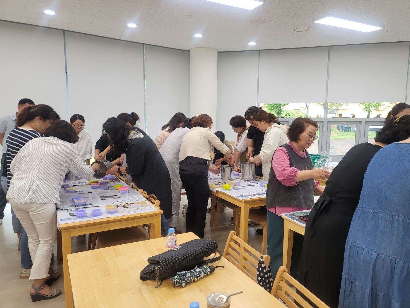 오전10시부터 12시까지 그림책을 통한 자녀와의 심리 소통 연수가 끝나고 점심시간을 통해 메타세콰이어 길을 걸으며 서로 친근해지는 시간을 갖았다. 오후에는 담양의 염색 명인 김영희 대표와 함께 대나무 액, 숯 쪽을 넣은 천연비누 만들기 활동을 했다. 비누가 고체화 될 시간동안 티 코스터에 프랑스자수를 놓으며 생태 활동 체험 시간을 갖았다.