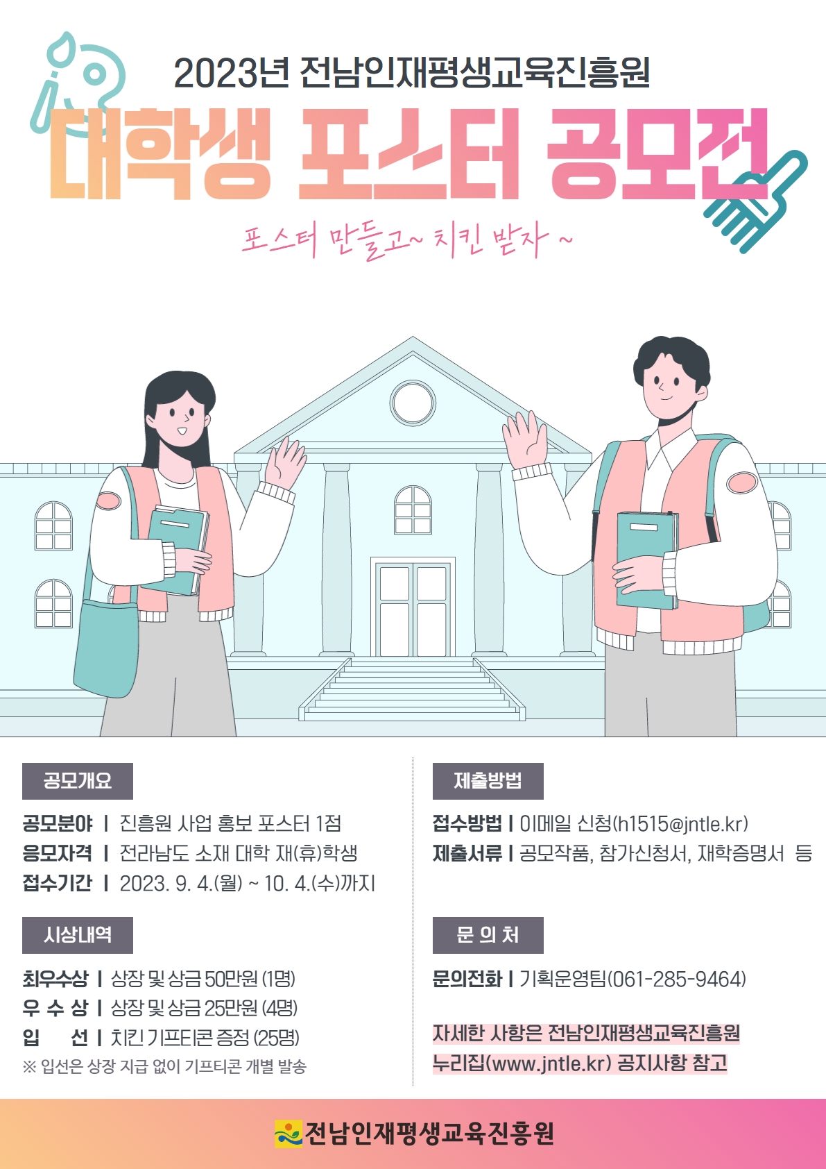전남인재평생교육진흥원(원장 고석규)은 도내 대학생의 참신한 아이디어를 발굴하여사업 홍보 포스터 디자인에 활용하고자 2023년 대학생 포스터 공모전을 개최한다고 4일 밝혔다.