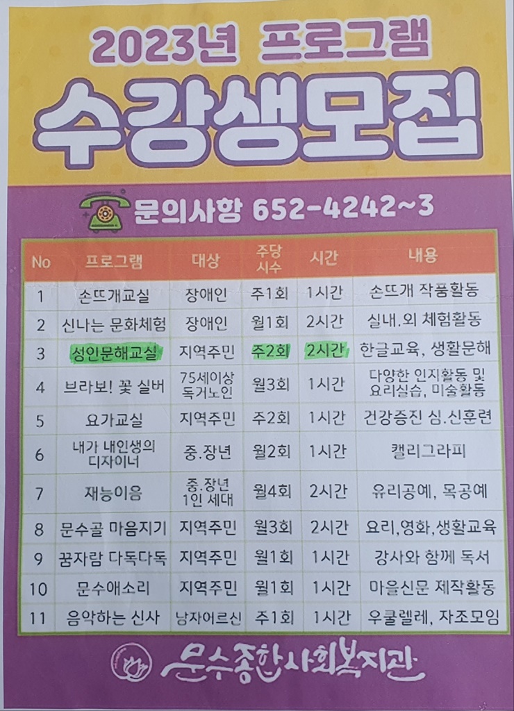 ‘문수종합사회복지관’에서는 11개의 프로그램을 운영하고 있다. 수업은 5월 1일부터 11월 30일까지 6개월 동안(8월은 방학) 진행한다.