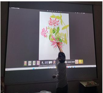 한지와 모필(한국화 붓)을 이용한 꽃 그리기의 처음은 베껴서 형태를 잡는 ‘형태따기’였다. 프린트된 인동초에 먹지를 덧대 한지에 옮긴 후 물감으로 색을 입히는 작업이다. 형태따는 과정이 만만찮아 수강생들의 앓는 소리가 여기 저기 들려왔다.