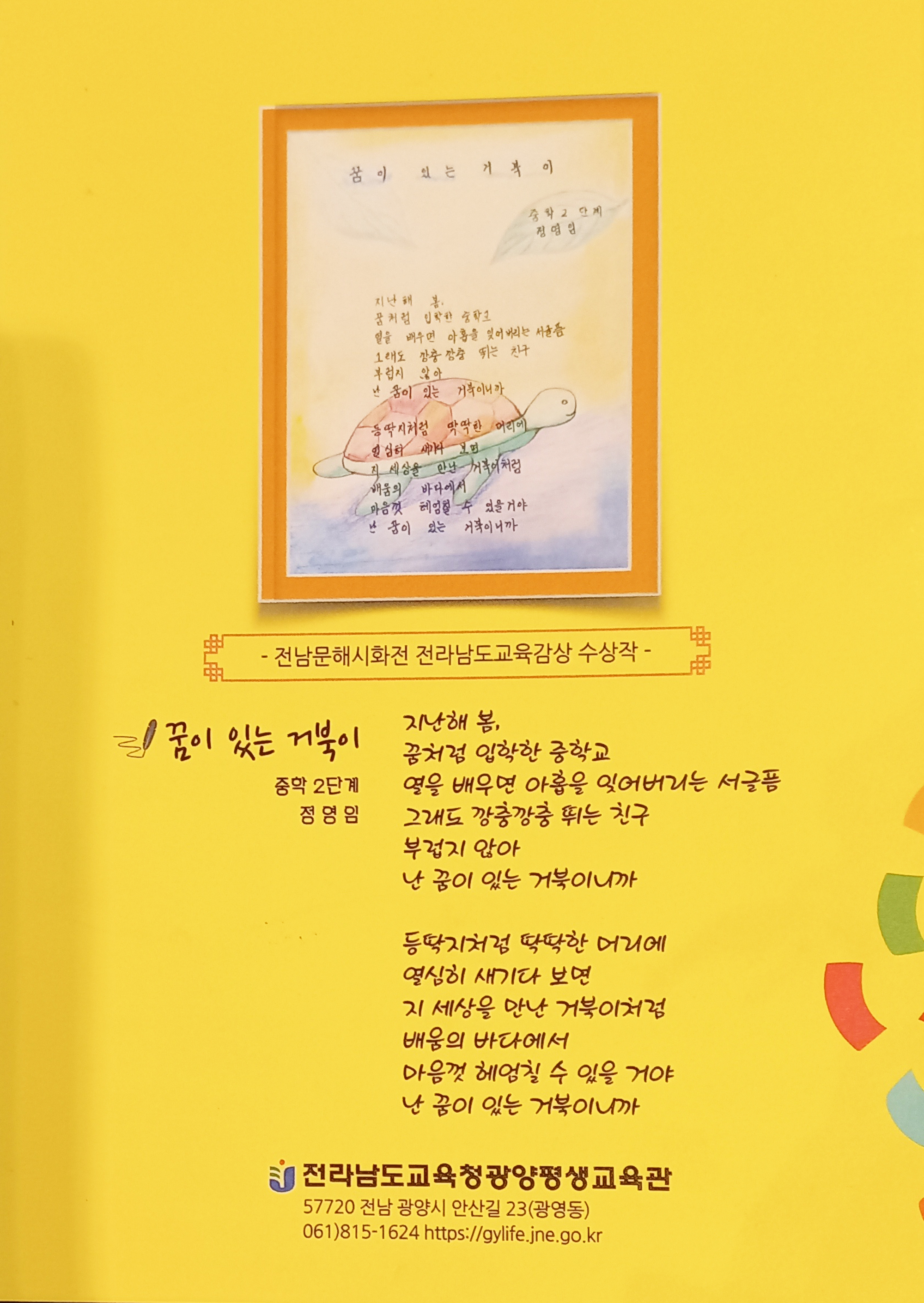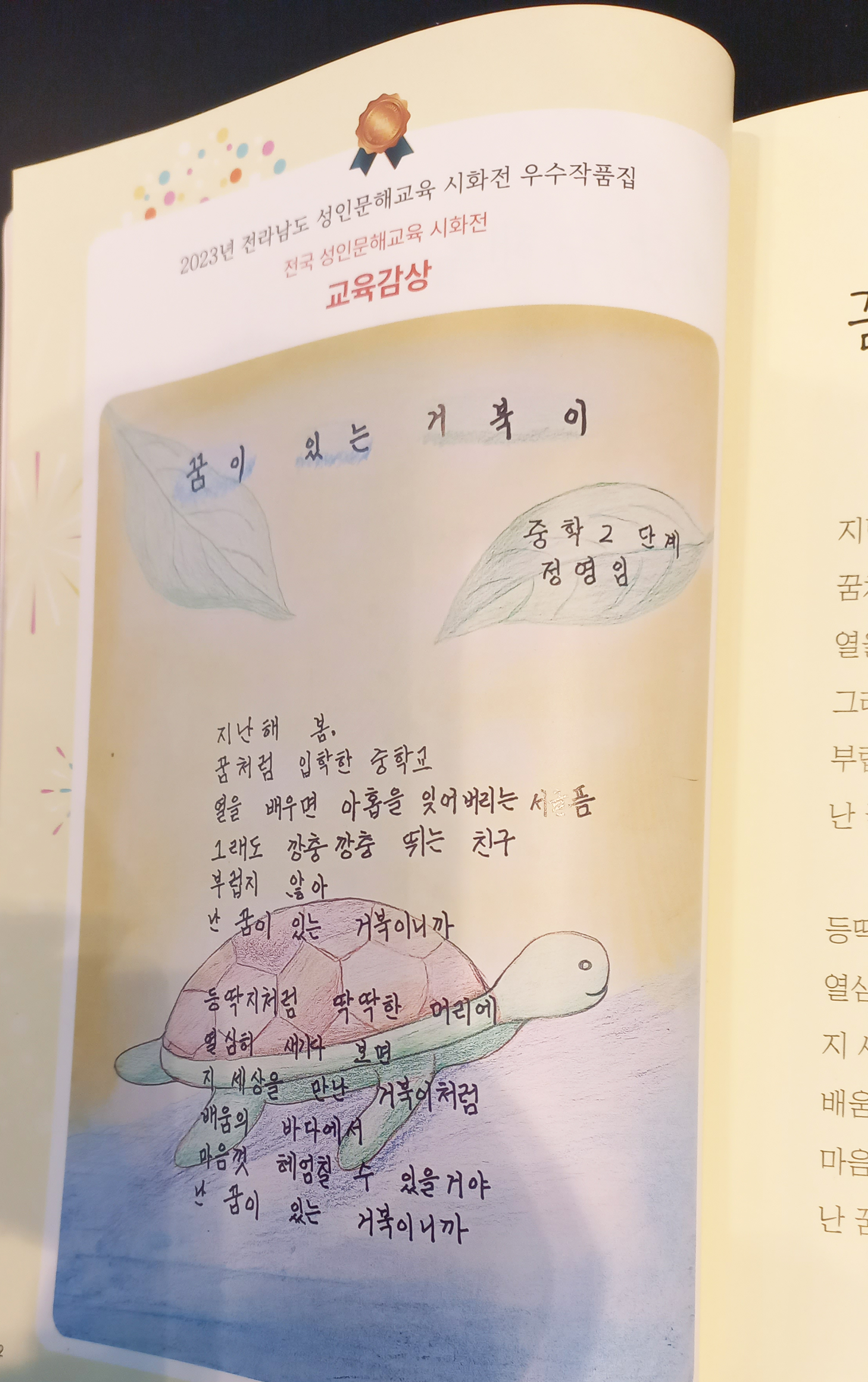 ​“가난해서 초등학교만 나왔습니다. 평생 공부하고 싶다는 생각으로 살아왔는데 중학교 단계가 생겼다는 이야기에 첫 번째로 등록했습니다. 국어, 영어, 수학, 사회, 과학, 미술 등 6과목이 있는데 그 중 국어가 재밌어요. 시 공부를 하면 머릿속에 쏙쏙 들어오는데 영어나 수학은 어렵더라구요. 선생님들이 입이 아프게 가르쳐 주시는데 돌아서면서 까먹어 버리는 저를 돌아보며 꿈이 있는 거북이를 썼습니다. 시가 뭔지도 모르고 마음에 있는 글을 썼는데 이렇게 좋은 상을 받아 잘 지도해준 선생님들께 너무 감사합니다. 제가 받아도 되나 싶어서 상 받는 날 손이 덜덜 떨리더라구요.”