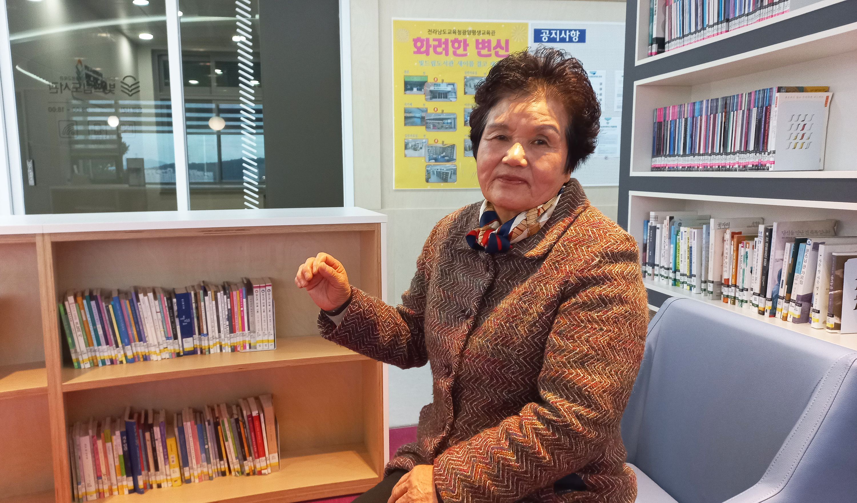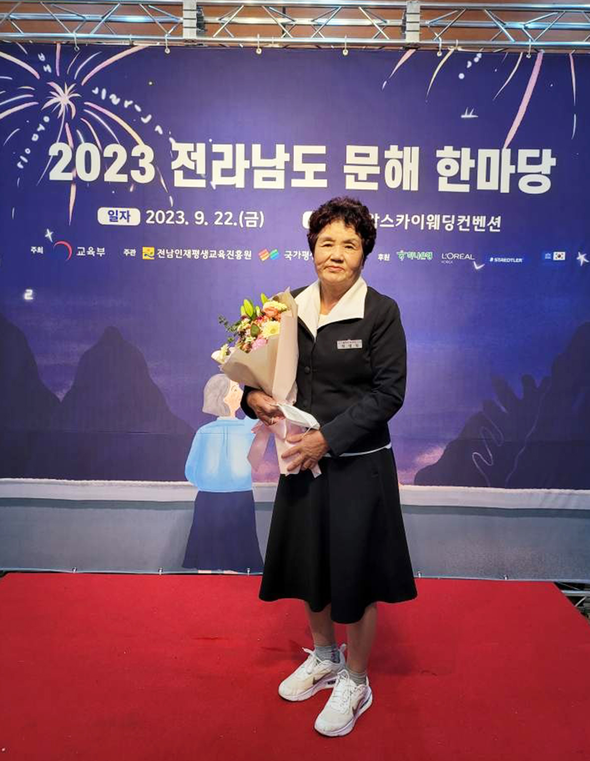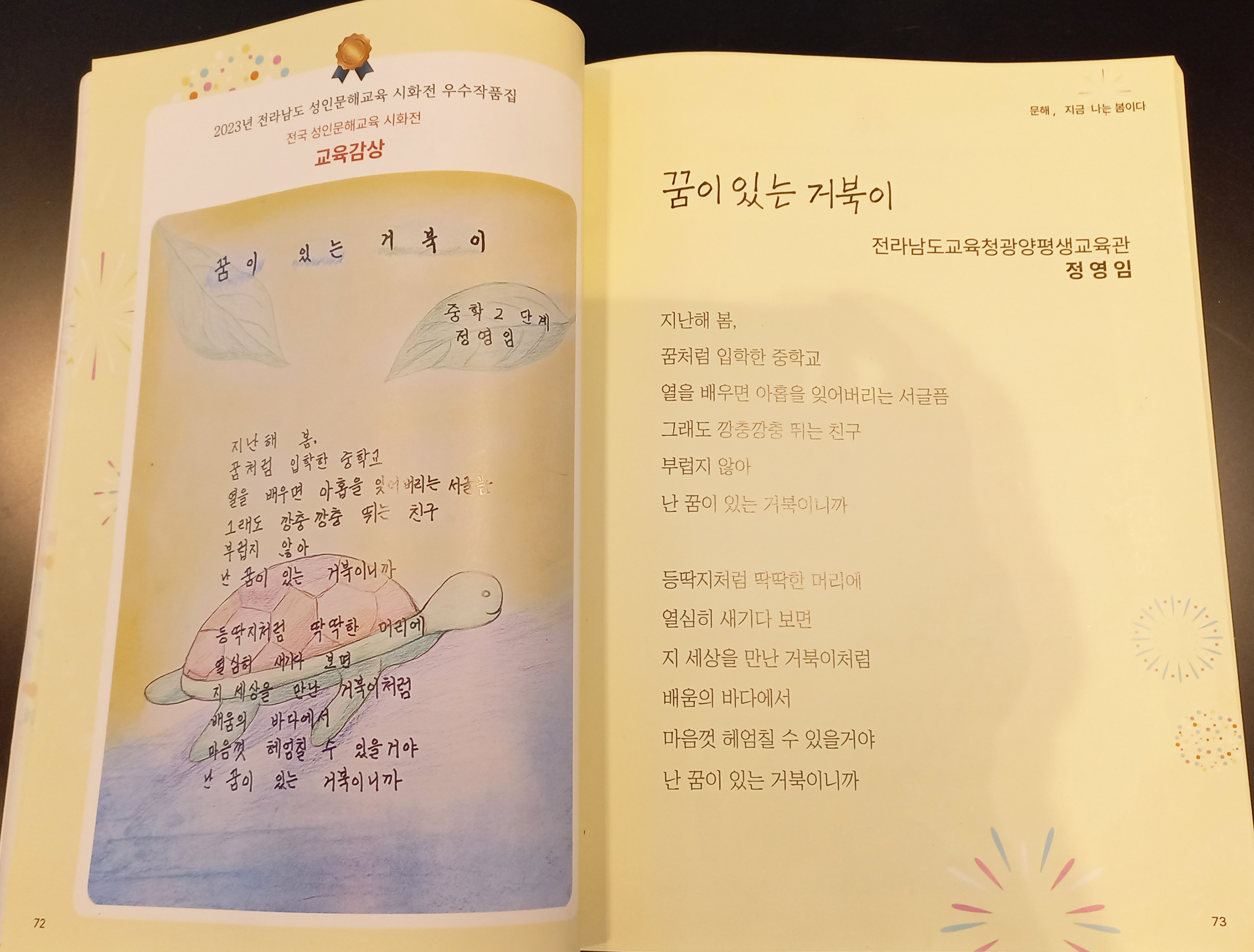 올해 중학과정 3학년인 정영임 어르신을 만났습니다. 중학과정 3학년 정영임 어르신은 지난해 성인문해교육 기간 동안 열린 시화전에서 “꿈이 있는 거북이”로 전라남도교육감 상을 수상했습니다.
