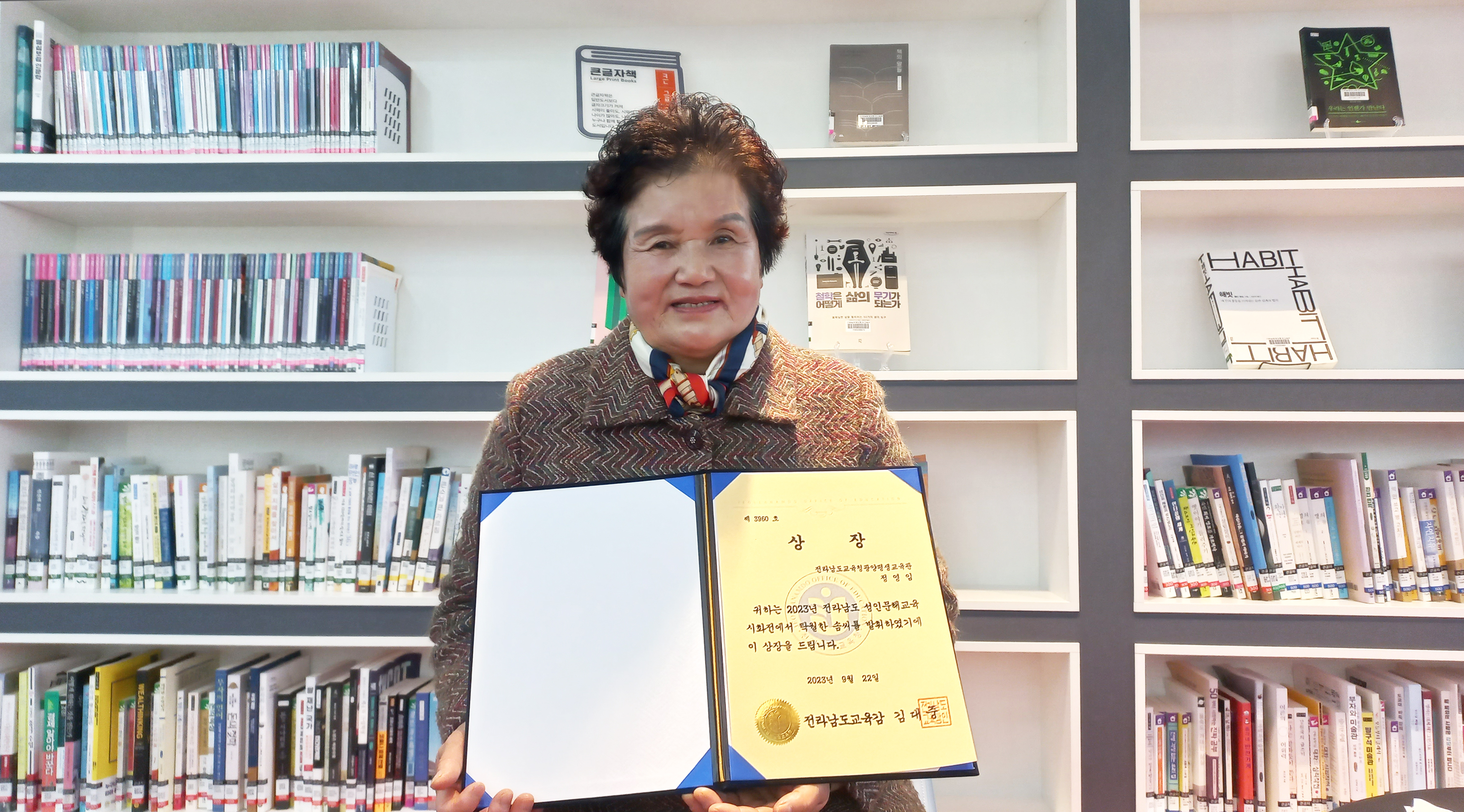 “2남 1녀 다 키워놓고 이제 다 늙어 공부하는데 교육감 상 받은 것이 집안의 영광이라며 축하해주는 아이들에게 감사해요. 며느리도 제 시를 찍어 가서 친구들께 자랑했다고 하더라구요.”