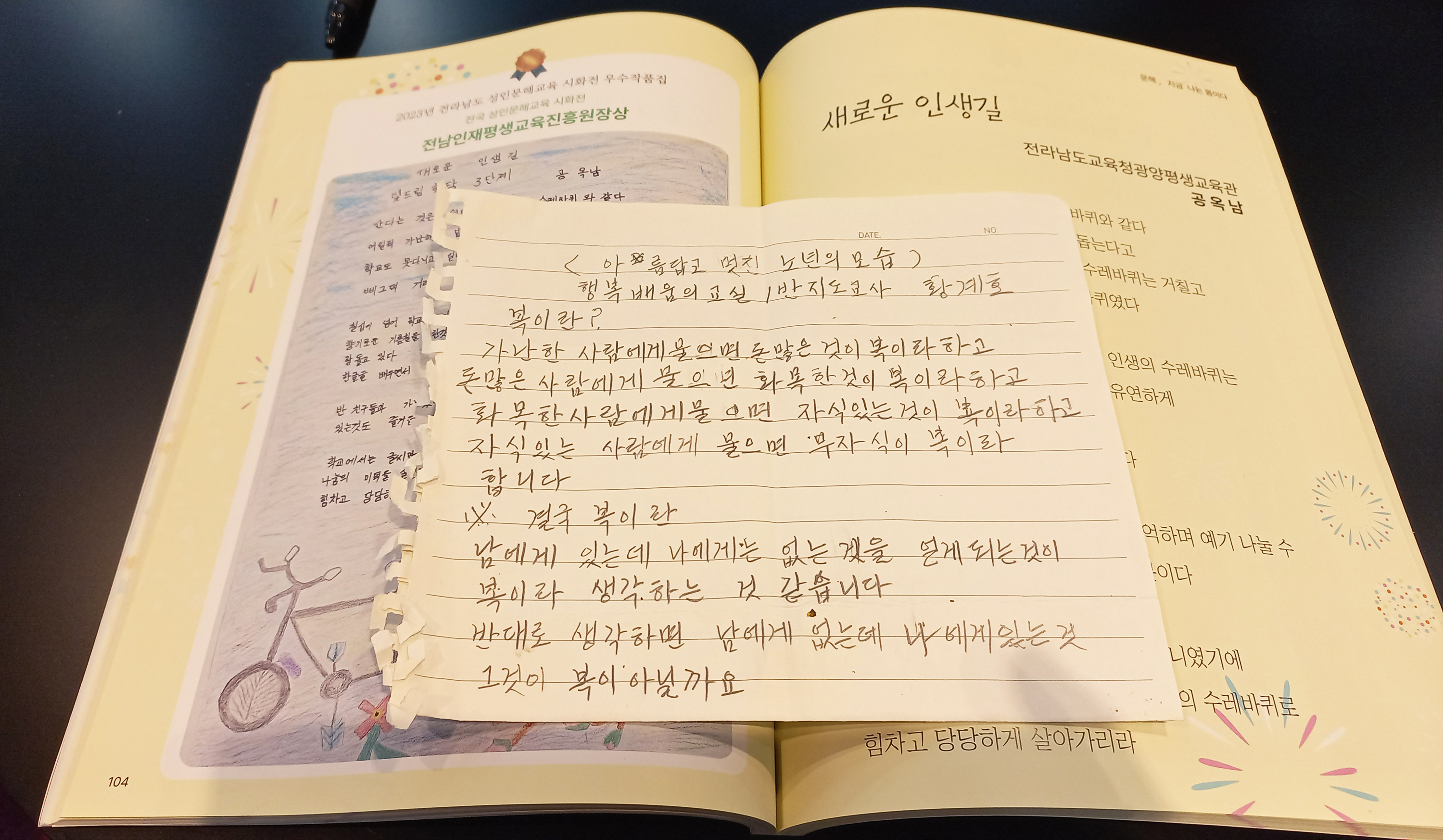 좋은 글은 밑줄치고 보고 의미를 깨우치느라 한참 걸렸는데 학교 다니면서부터는 의미를 알고 책을 읽게 되니 재밌다는 어르신은 자꾸 잊어버리지만 늦더라도 천천히 가자는 생각으로 공부한다고 합니다. “공부할 때 1등을 해야겠다는 생각으로 하면 스트레스가 쌓이는데 열 자를 배워서 아홉 글자를 잊어버리고 한글자만 배워도 소중하다는 생각으로 다닙니다. 광양평생교육관은 시설도 좋고 강사도 좋고 답답한 저희들을 가르쳐 주는데 얼마나 감사한지 몰라요. 더 많은 사람들이 중학교 공부를 했으면 합니다.”