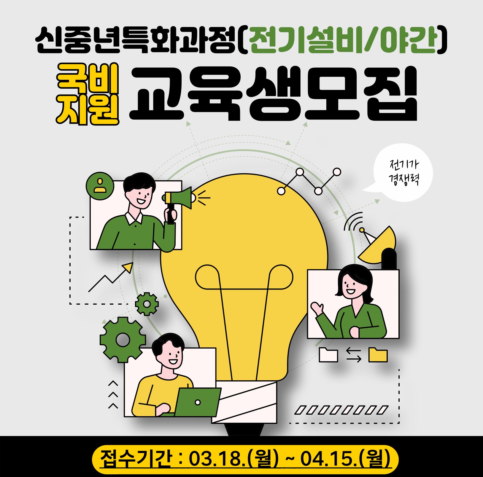 전기설비과정 야간반은 만 40세 이상 대한민국 국민 중 미취업자, 영세 자영업자, 비정규직 근로자라면 누구나 신청할 수 있으며, 모집기간은 3월 18일부터 4월 15일까지 29일간 진행한다. 자세한 문의는 061-720-1510~4로 문의하면 되며, 더불어 한국폴리텍대학 순천캠퍼스 홈페이지(suncheon.kopo.ac.kr)에서 확인할 수 있다.