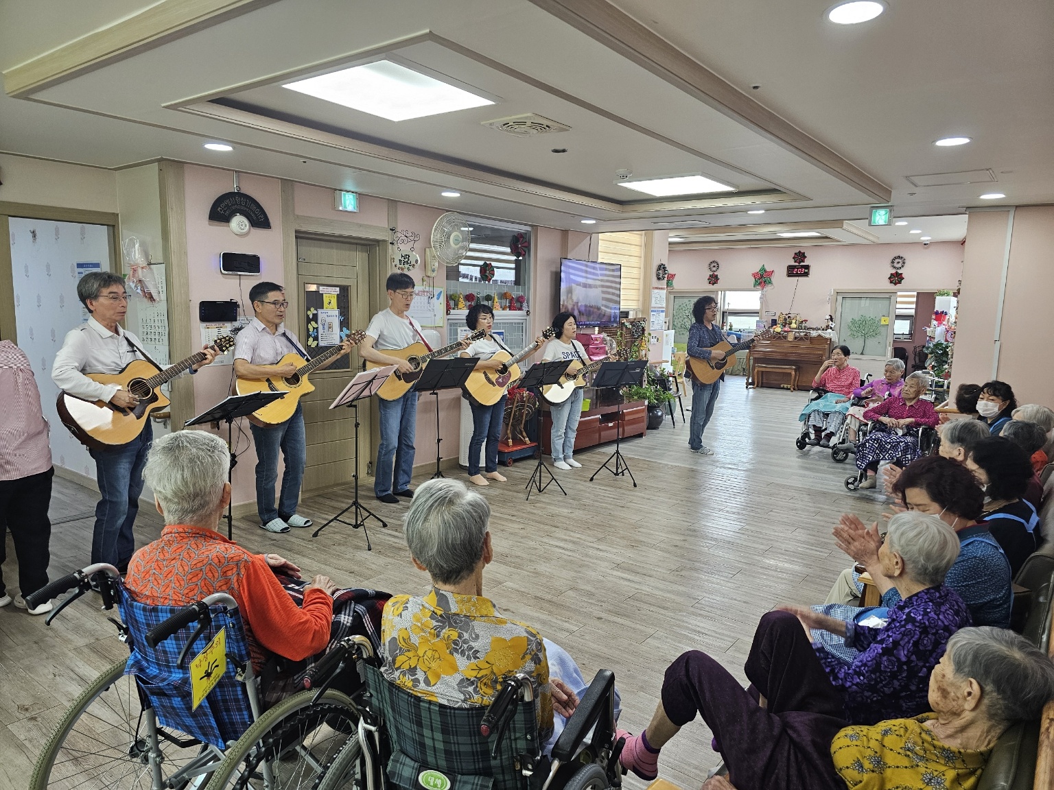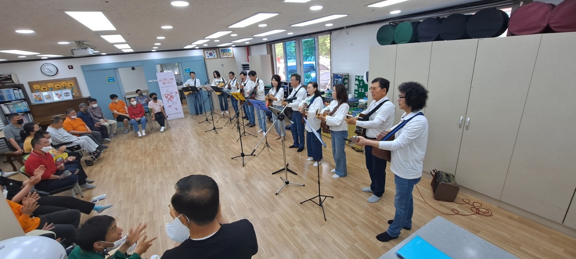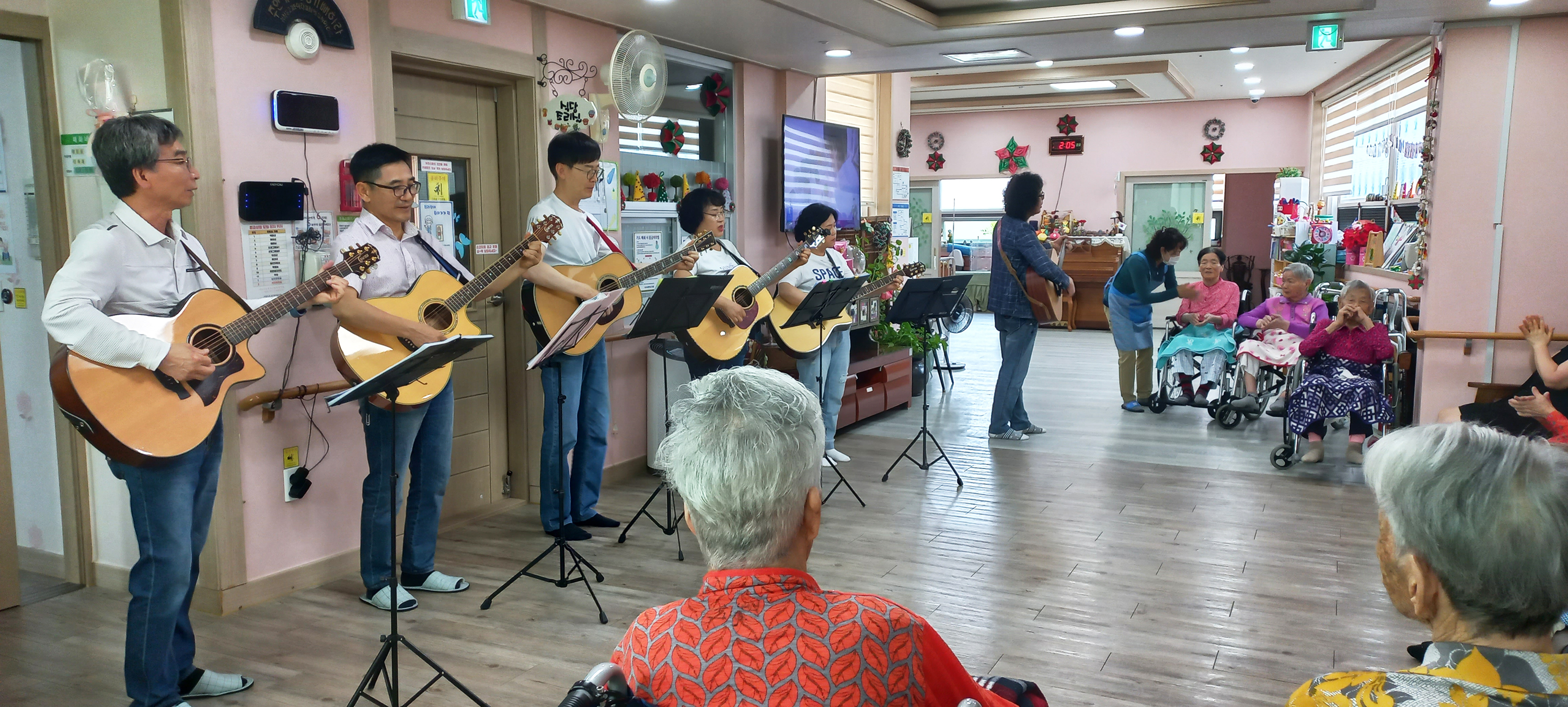 ‘음악이 있는 곳에’ 동아리 회장인 그는 알고 보니 30년 전에 통기타를 접한 실력파, 학창시절 기타 소리에 반해 배웠다가 직장생활 하면서 잊고 지냈다고 합니다. “통기타 세대라 그 당시에는 누구나 기타를 배웠지요. 그리고 바쁘게 살다 보니 잊고 지내다 퇴직 후 다시 기타를 접한 이유는 함께 하면 행복하기 때문입니다. 행복은 누구나 말하지만 나눔으로 채워지고 계산없이 주는 행복은 값진 것이라 마음이 부자가 됩니다. 회사에 다니며 봉사할땐 의무라고 생각했는데 퇴직해서 기타 봉사에 합류하다 보니 의무가 아니라 또 다른 기쁨이고 행복이란 것을 깨닫습니다. 나이 들어가며 배움에 호기심을 갖는다는 건 자신에겐 설렘이고 이웃에겐 사랑을 나눌 수 있으며 아름답게 세상을 만들어 가는데 동참할 수 있어 아주 좋습니다.” 기타 봉사할때마다 하모니카 연주도 곁들이는 김정호 동아리 회장, 지속적으로 봉사하겠다는 그는 인생의 전환점에 서서 삶의 에너지를 찾고 그 에너지가 자신과 주변의 삶을 행복하게 할 수 있다는 것은 큰 축복이라며 봉사는 해본 사람만이 아는 참 행복이라며 활짝 웃었습니다.