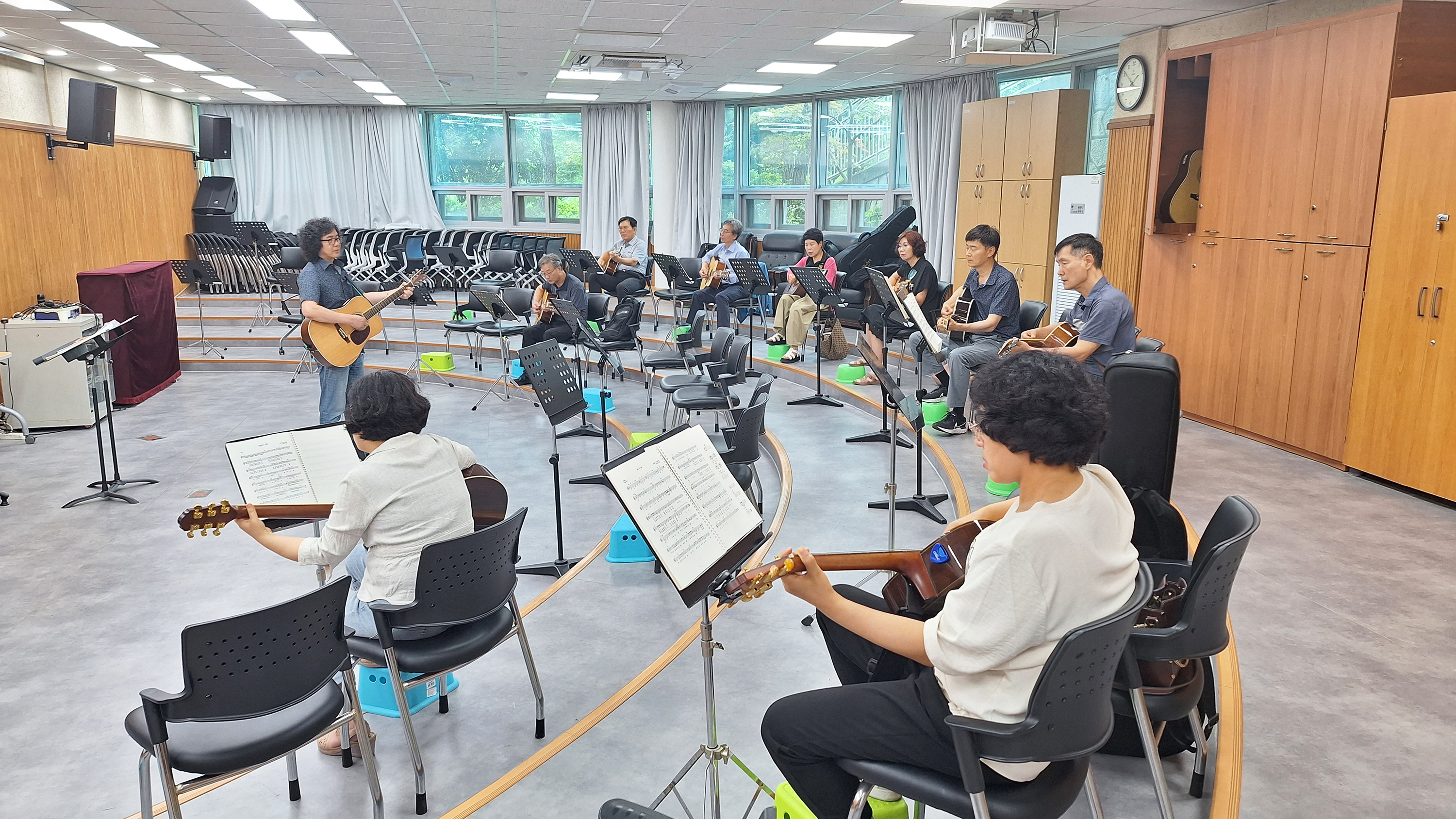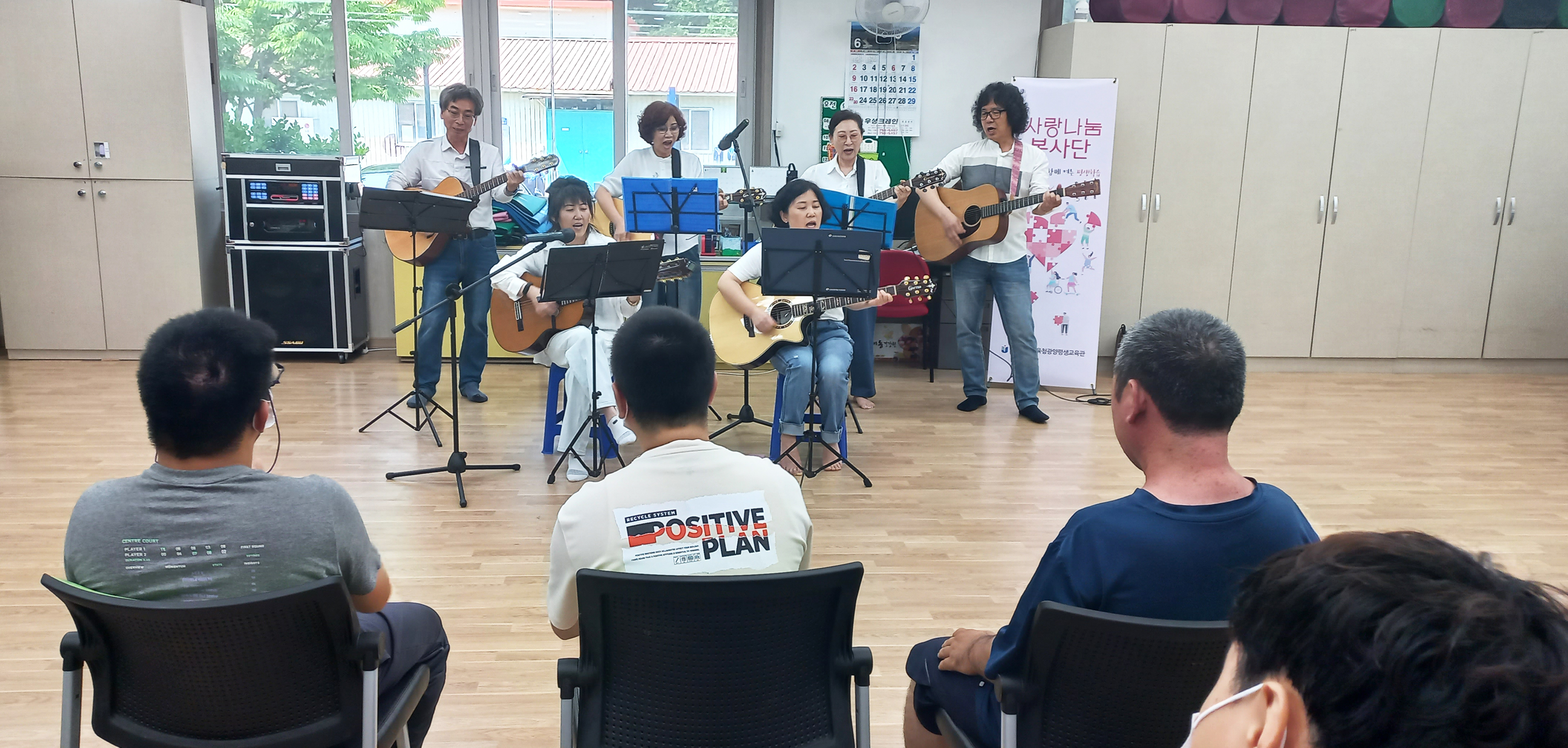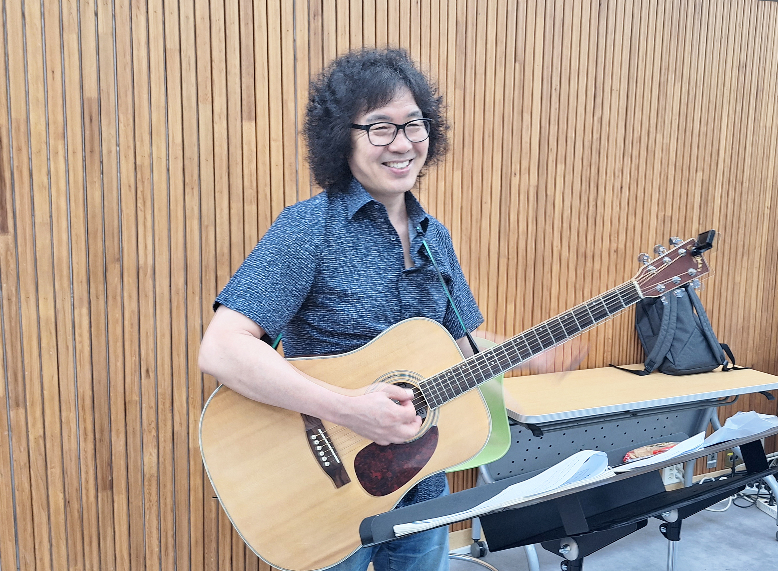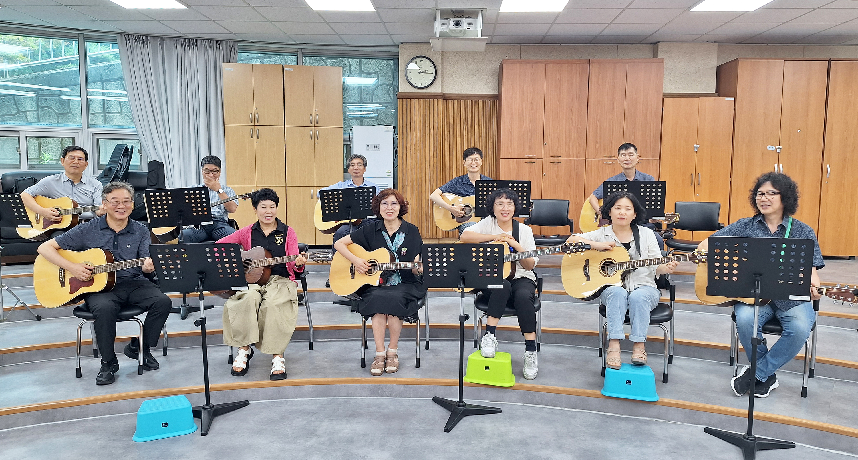 ‘음악이 있는 곳에’ 동아리 회장인 그는 알고 보니 30년 전에 통기타를 접한 실력파, 학창시절 기타 소리에 반해 배웠다가 직장생활 하면서 잊고 지냈다고 합니다. “통기타 세대라 그 당시에는 누구나 기타를 배웠지요. 그리고 바쁘게 살다 보니 잊고 지내다 퇴직 후 다시 기타를 접한 이유는 함께 하면 행복하기 때문입니다. 행복은 누구나 말하지만 나눔으로 채워지고 계산없이 주는 행복은 값진 것이라 마음이 부자가 됩니다. 회사에 다니며 봉사할땐 의무라고 생각했는데 퇴직해서 기타 봉사에 합류하다 보니 의무가 아니라 또 다른 기쁨이고 행복이란 것을 깨닫습니다. 나이 들어가며 배움에 호기심을 갖는다는 건 자신에겐 설렘이고 이웃에겐 사랑을 나눌 수 있으며 아름답게 세상을 만들어 가는데 동참할 수 있어 아주 좋습니다.” 기타 봉사할때마다 하모니카 연주도 곁들이는 김정호 동아리 회장, 지속적으로 봉사하겠다는 그는 인생의 전환점에 서서 삶의 에너지를 찾고 그 에너지가 자신과 주변의 삶을 행복하게 할 수 있다는 것은 큰 축복이라며 봉사는 해본 사람만이 아는 참 행복이라며 활짝 웃었습니다.
