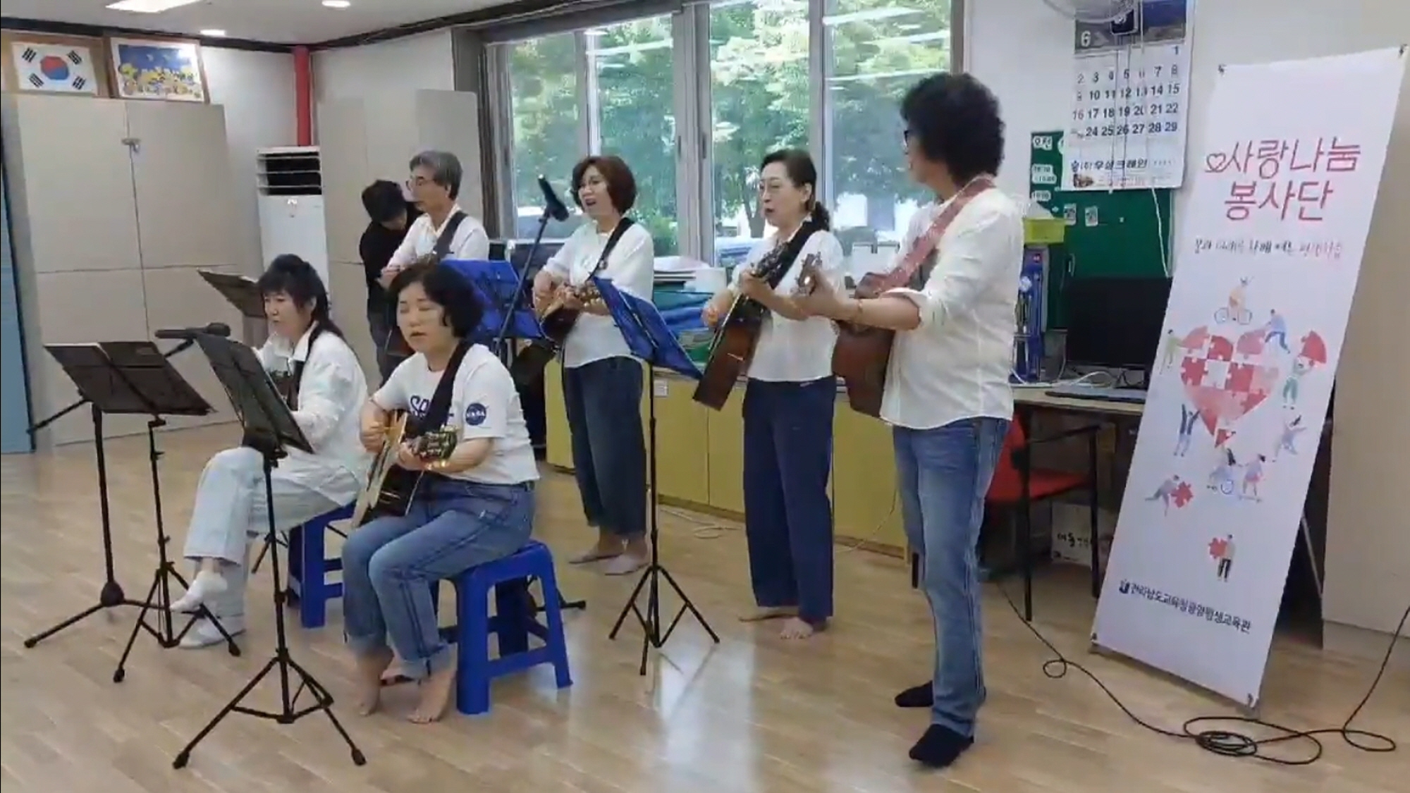 ‘음악이 있는 곳에’ 동아리 회원은 15명, 중급반 수강하는 수강생 모두가 광양평생교육관에서 운영하고 있는 사랑나눔 봉사동아리에 가입해 어려운 이들에게 고운 선율을 들려주며 행복과 희망을 나누고 있습니다. 공연때 주로 동요나 어르신들이 즐겨 부르던 옛날 가요를 선택하는 이유는 함께 부르며 즐기는 시간을 갖기 위해서랍니다.