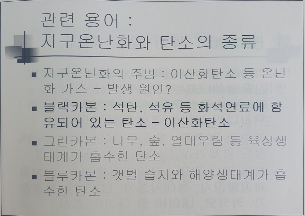 지구 온난화의 주범은 이산화탄소(CO₂)이다. 탄소(카본)에는 ‘블랙카본(black carbon. 이산화탄소), 그린카본(green carbon), 블루카본(blue carbon)’ 등이 있다.