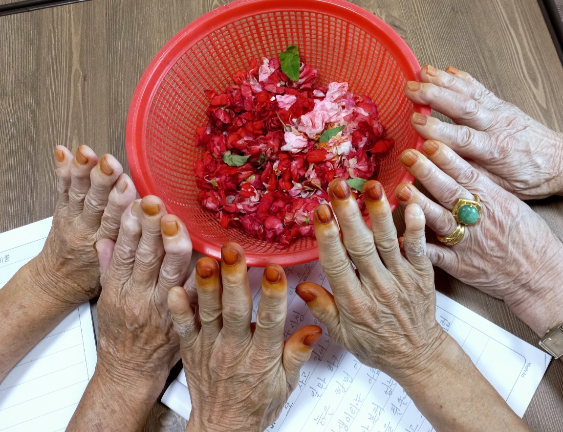 다지기 시간에는 내 손의 역사인 주름진 손에 대한 예술적 승화로 석고를 활용해 손 모양 본뜨기를 하였다. 절차가 좀 복잡하고 힘들었지만 잘 빚어진 학습자는 황금 손이 된 모양을 보고 너무 기뻐하였다. 어느 교실은 손톱에 봉숭아 꽃물을 들여 자랑하였다. 부교재로 양손을 예쁘게 꾸며보고 하고 싶은 말을 써 보도록 하였다.