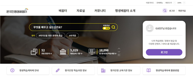온국민평생배움터는 대한민국의 모든 국민이 언제 어디서나 평생교육의 혜택을 누릴 수 있도록 돕는 혁신적인 플랫폼입니다. 이곳을 통해 다양한 학습 기회를 활용하고, 자신의 학습 이력을 체계적으로 관리하며, 나아가 학력 인정까지 받을 수 있는 다양한 혜택을 누리실 수 있습니다. 이처럼 온국민평생배움터는 우리 모두가 배움을 통해 성장할 수 있는 든든한 지원군입니다. 이제 집에서도 평생교육을 통해 삶의 질을 높이고, 새로운 배움의 즐거움을 발견하시기 바랍니다.