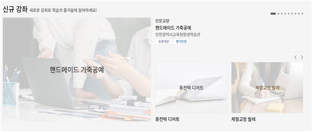 또한, 각 지역의 지자체에서 제공하는 강좌들도 온국민평생배움터에서 온라인으로 수강할 수 있습니다. '신규강좌' 탭에서는 인천광역시교육청평생학습관에서 제공하는 핸드메이드 가죽공예나 한국복지사이버대학교부설평생교육원의 다문화놀이교육 등의 강좌가 개설되어 있습니다. 이러한 강좌들은 지역 사회의 특성과 요구를 반영한 맞춤형 교육을 제공함으로써, 학습자들이 더 큰 관심을 가지고 참여할 수 있도록 돕습니다.