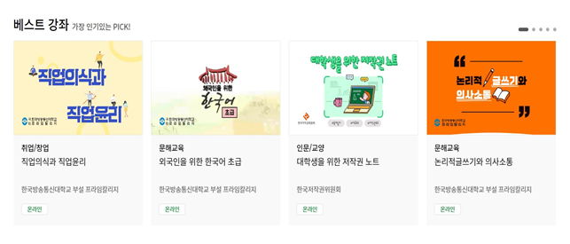 플랫폼에서 제공되는 콘텐츠는 매우 다양합니다. '베스트 강좌' 탭에서는 직업의식과 직업윤리, 외국인을 위한 한국어 초급, 대학생을 위한 저작권 노트, 논리적 글쓰기와 의사소통 등 각종 기관에서 제공하는 인기 강좌를 만나볼 수 있습니다. 이 중 제가 특히 인상 깊게 수강했던 강좌는 '나를 변화시키는 긍정의 힘'이었습니다. 이 강좌를 통해 힘든 상황에서도 긍정적인 사고를 유지하는 것이 얼마나 중요한지 다시금 깨달을 수 있었습니다.