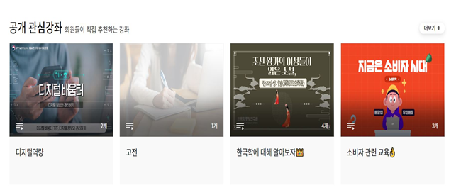 온국민평생배움터는 모든 국민에게 맞춤형 학습 경험을 제공하기 위해 다양한 카테고리의 강좌를 운영합니다. '공개 관심강좌' 탭에서는 회원들이 직접 추천한 강좌들을 확인할 수 있습니다. 여기에는 디지털 역량 강화, 소비자 관련 교육, 고전 교육 등 다양한 분야의 강좌가 포함되어 있습니다. 이러한 강좌들은 개인의 흥미와 필요에 맞춰 선택할 수 있어, 학습자들의 학습 동기를 더욱 높여줍니다.