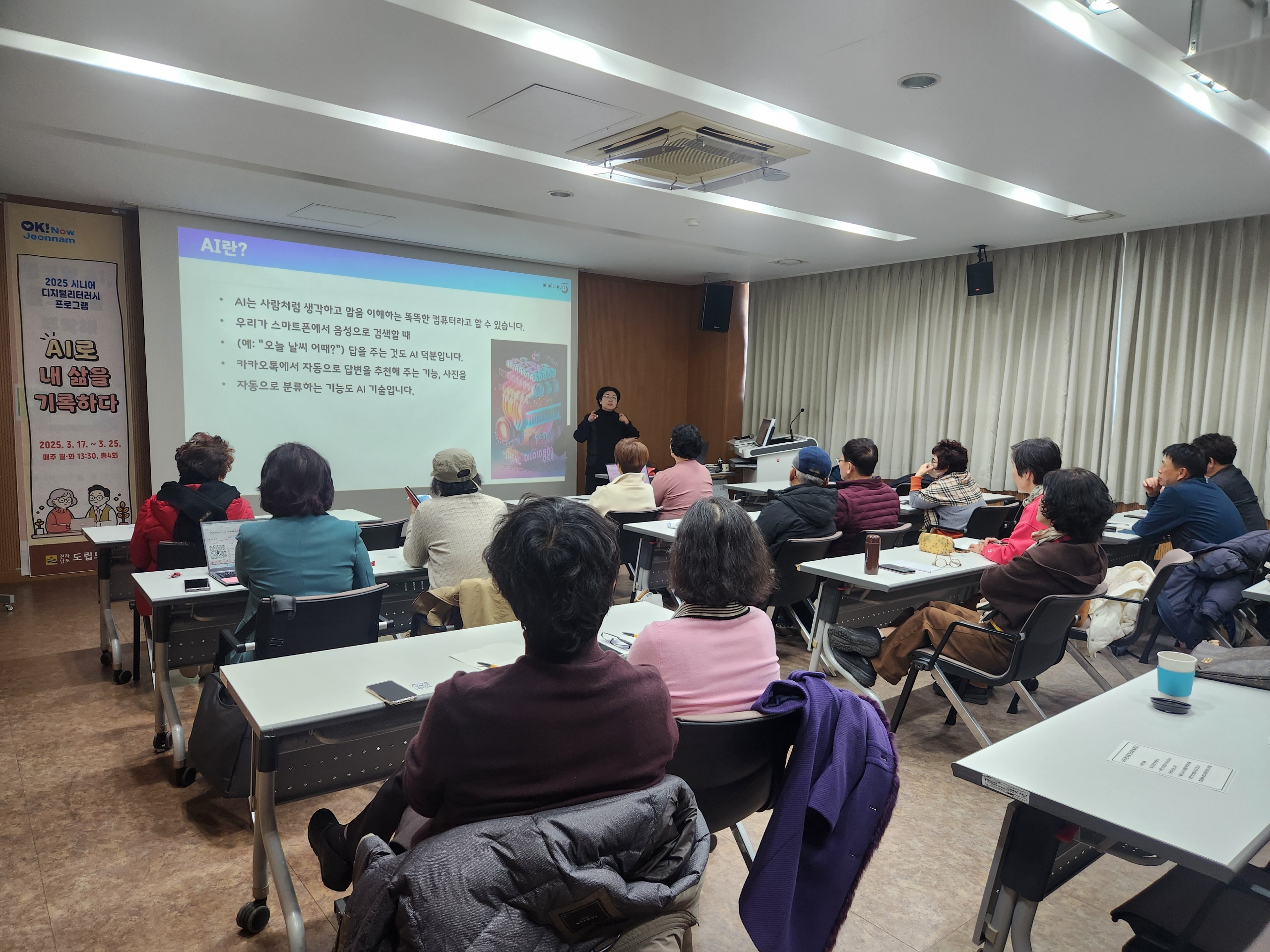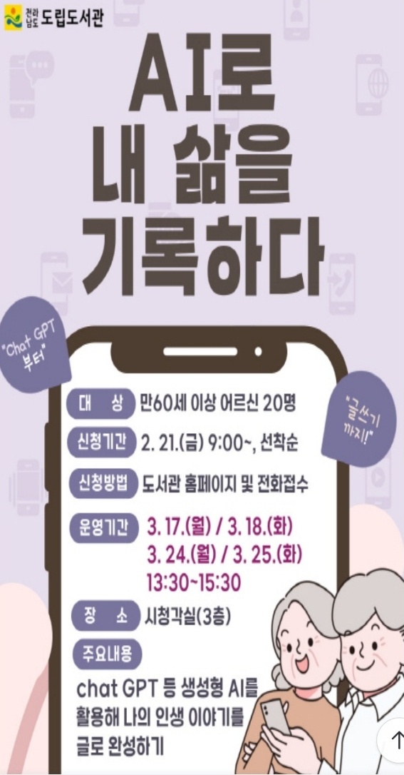 시니어 디지털 리터러시 교육이 전라남도도립도서관에서 진행되었다 전라남도 시니어들의 삶이 인공지능과 만나 새로운 기록으로 탄생한다. 디지털 세대의 문턱을 넘지 못해 소외감을 느끼던 어르신들에게 따뜻한 변화의 시간이 찾아왔다. 전남도립도서관이 주관하는 특별한 평생교육 프로그램 ‘AI로 내 삶을 기록하다’가 3월 전남도립도서관에서 개강되었다. 이번 프로그램은 디지털 기술에 익숙하지 않은 60세 이상 시니어를 대상으로, 인공지능(AI)을 활용한 자기 표현과 기록 방법을 쉽고 친근하게 배울 수 있도록 기획되었다.