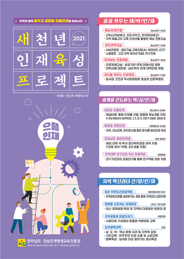 ‘새천년 인재육성 프로젝트’는 ‘인재가 전남의 희망입니다’라는 가치 아래 3개 분야 16개 사업으로 구성, 매년 100억 원을 들여 미래 지역을 이끌 인재를 집중 육성하는 시책이다.